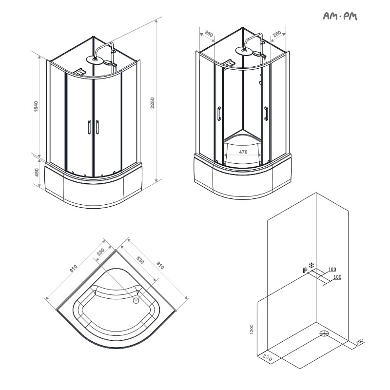 Душевая кабина бренда AM.PM коллекции Above без крыши с верхним тропическим душем представляет стильное решение для вашей ванной комнаты. Душевая кабина отлично впишется в ваш интерьер. Форма кабины - 1/4 круга. Цвет профиля - черный матовый. Размер (Ш/Г/В): 910x910x2250 мм. Высота поддона - 450 мм. Материал задних стенок - стекло. Материал дверок - прозрачное стекло. Толщина стекла - 4 мм.